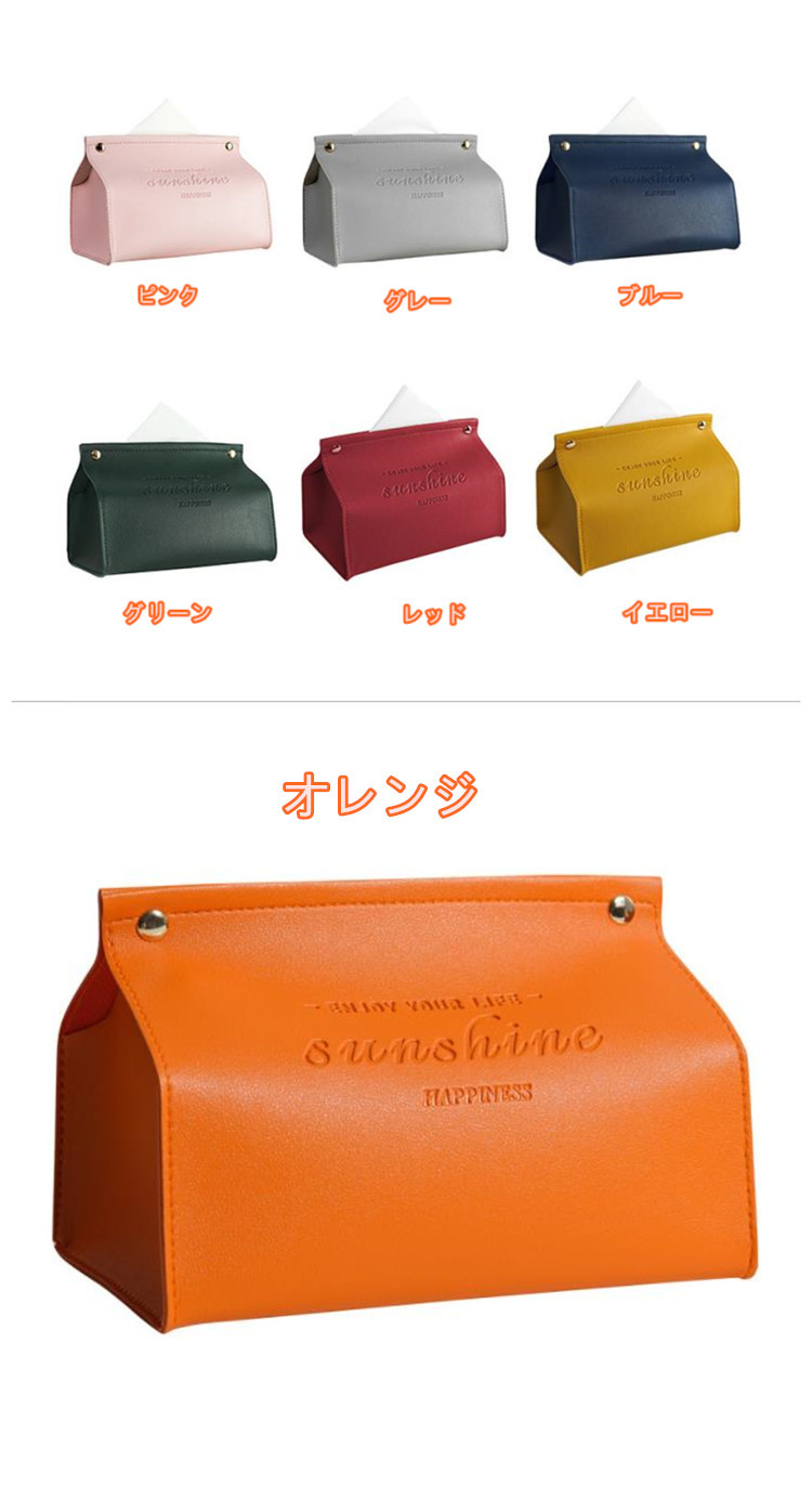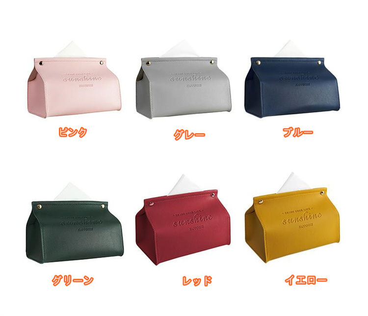 高級感のあるレザー素材を使用したおしゃれなティッシュケースです。 リビングや車内でお使いいただける実用的なデザインで、平口タイプで取り出しやすい構造になっています。 豊富な6色展開(レッド・ピンク・イエロー・グレー・ブルー・グリーン)からお選びいただけます。