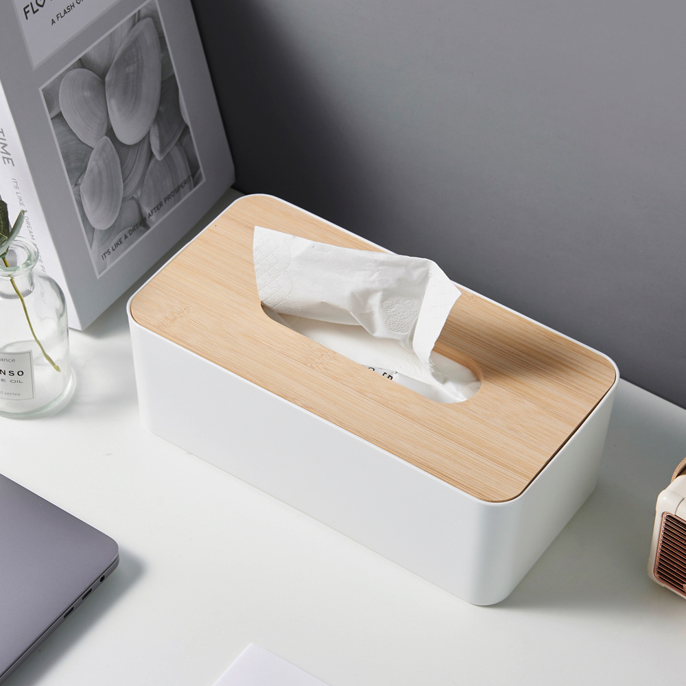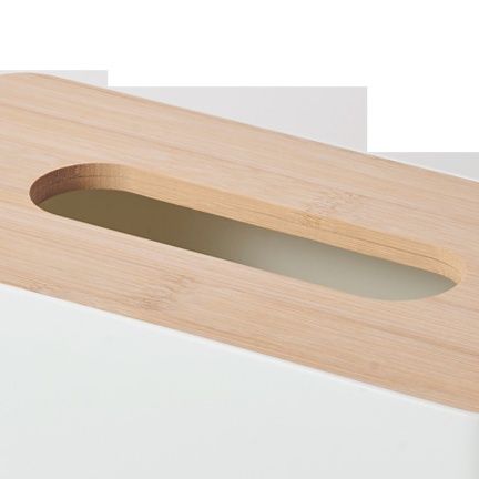 天然木風の蓋が温かみを添えるプラスチック製のティッシュケースです。