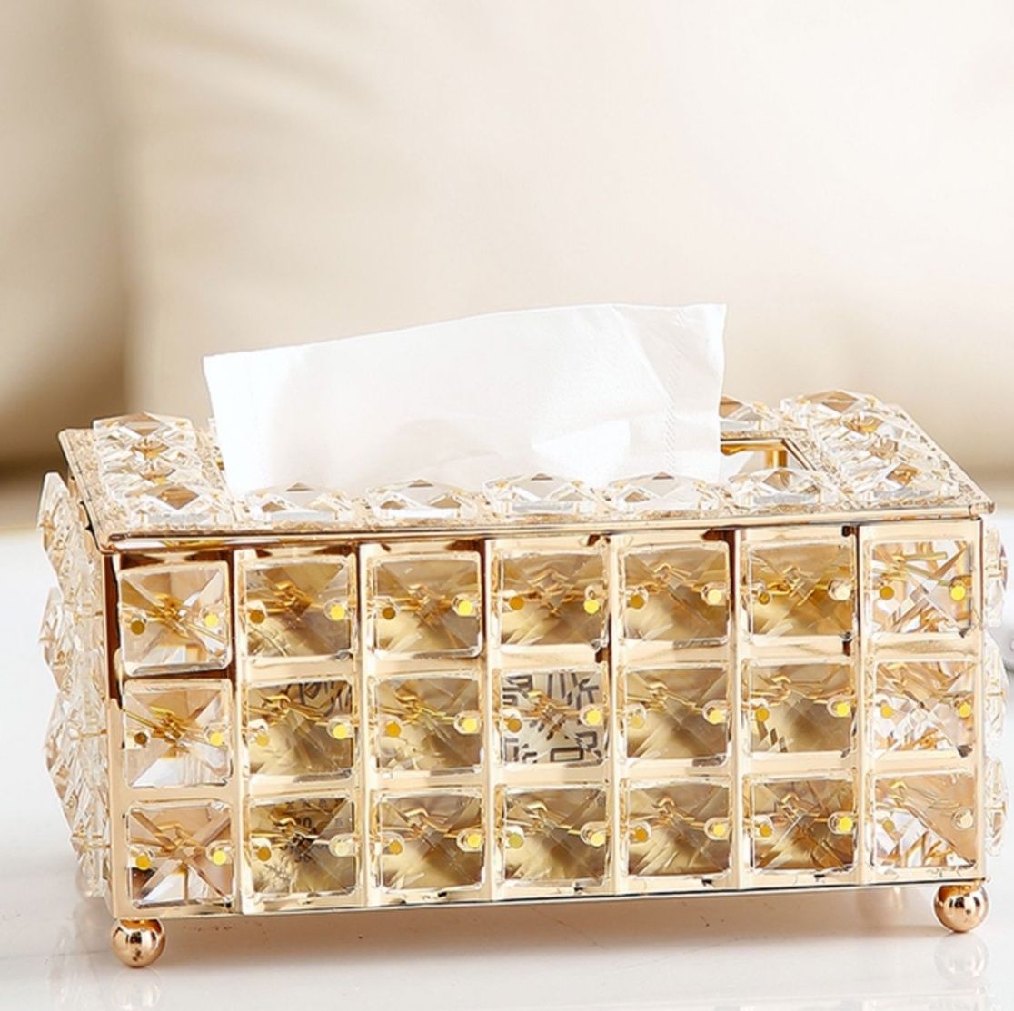 繊細なカット加工を施したガラスの輝きが美しいティッシュケースです。