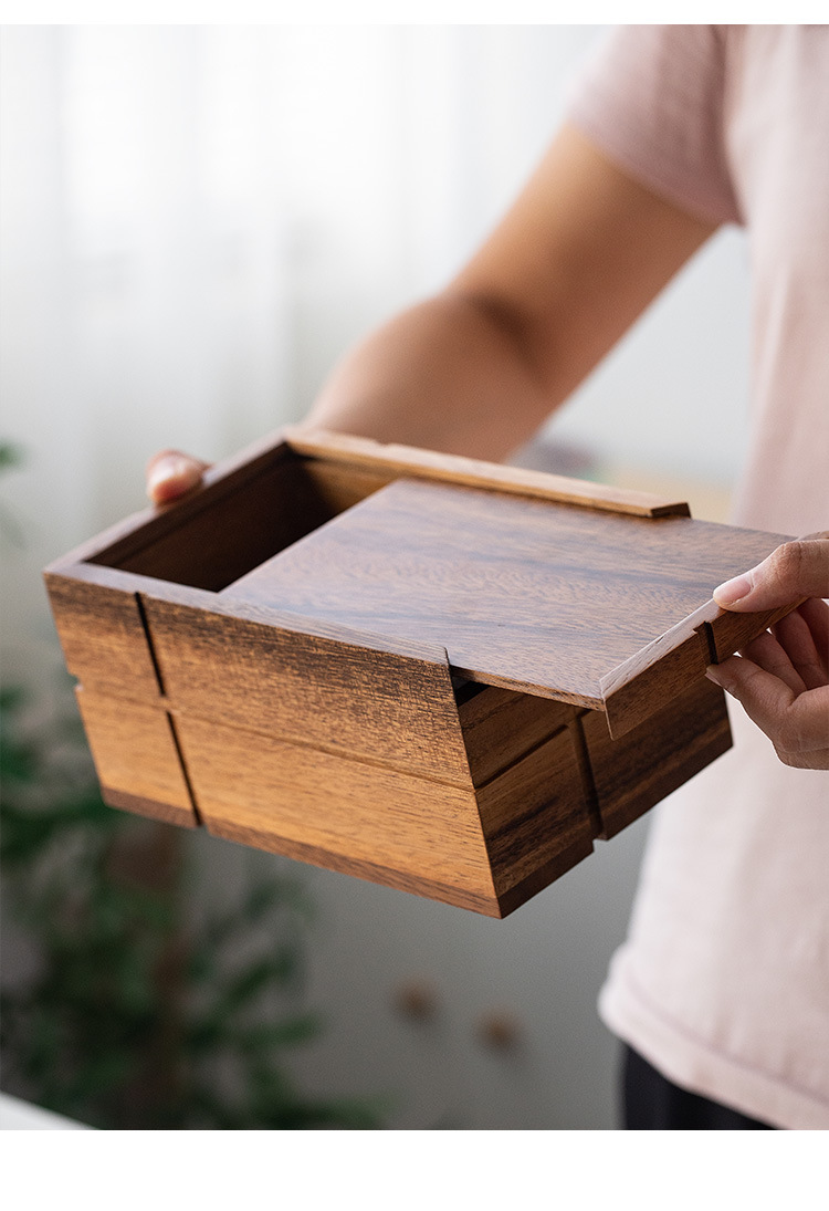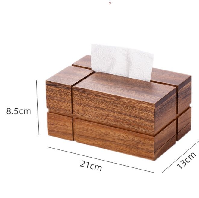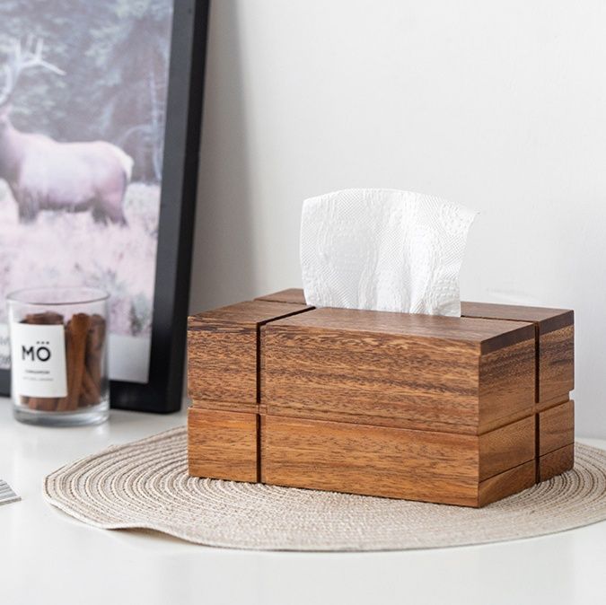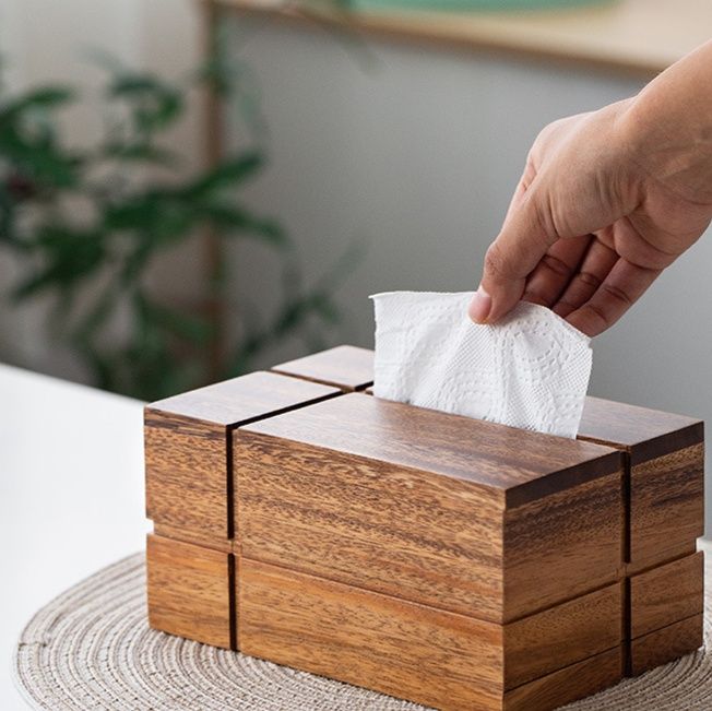 まるで積み木を重ねたようなユニークな構造が目を引く木製のティッシュケースです。