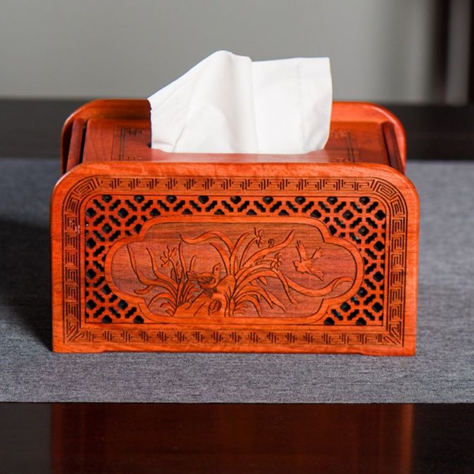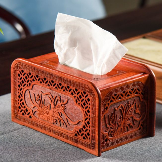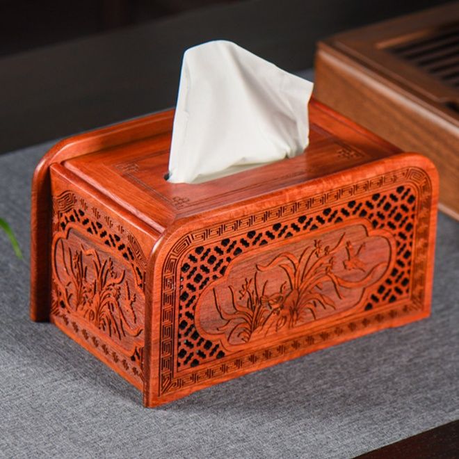 伝統的な透かし彫り技法で蓮の花を立体的に表現した木製のティッシュケースです。