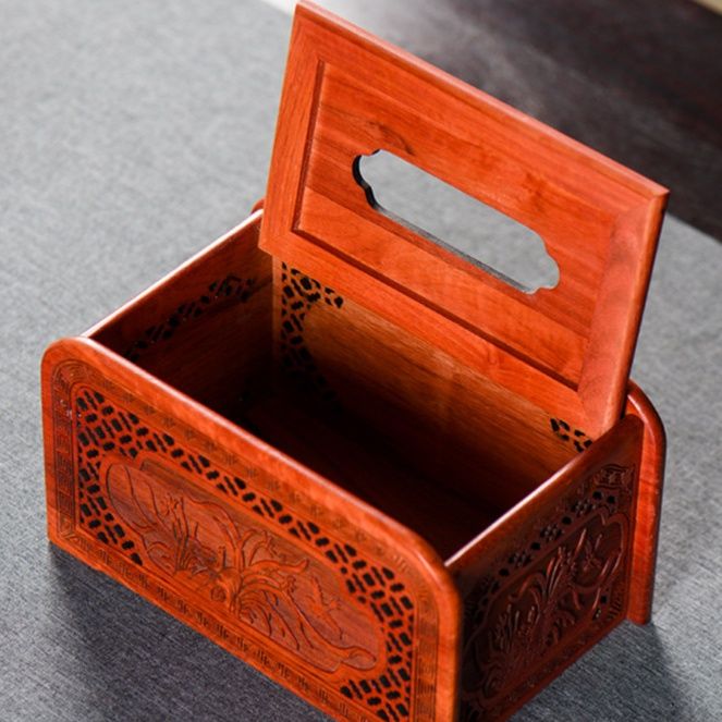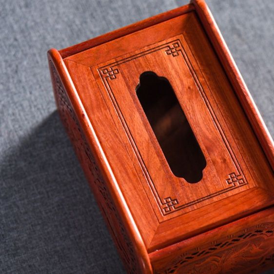伝統的な透かし彫り技法で蓮の花を立体的に表現した木製のティッシュケースです。 四面すべてに施された繊細な格子模様と花鳥のモチーフが、空間に上質な和の趣を演出します。 職人の手仕事による丁寧な彫刻が美しく、リビングや書斎、和室など様々な場所で活躍します。 木のぬくもりを感じられる実用的でありながら装飾性の高い逸品です。
